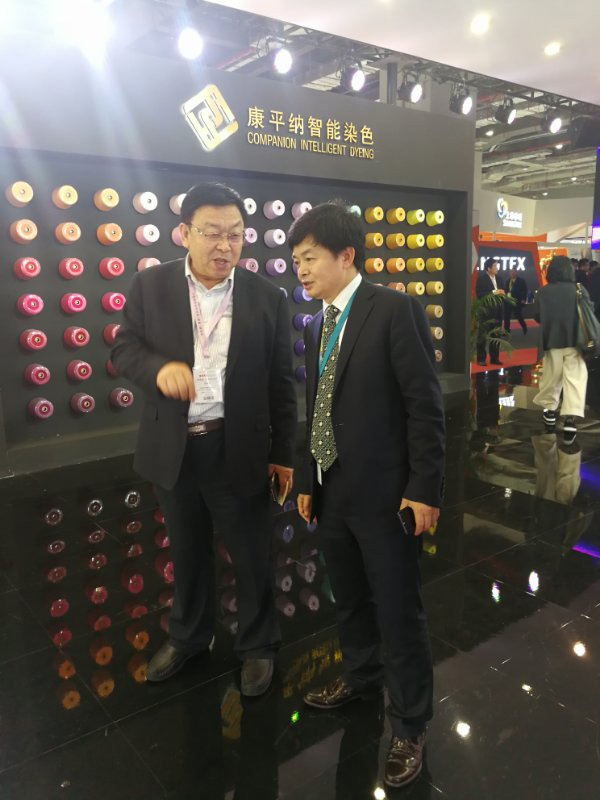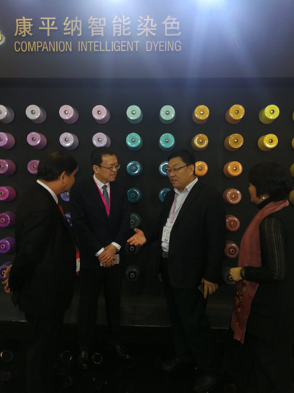 4、中國(guó)紡織工業(yè)聯(lián)合會(huì)副會(huì)長(zhǎng)李陵申、紡織規(guī)劃院院長(zhǎng)馮德虎參觀康平納展位